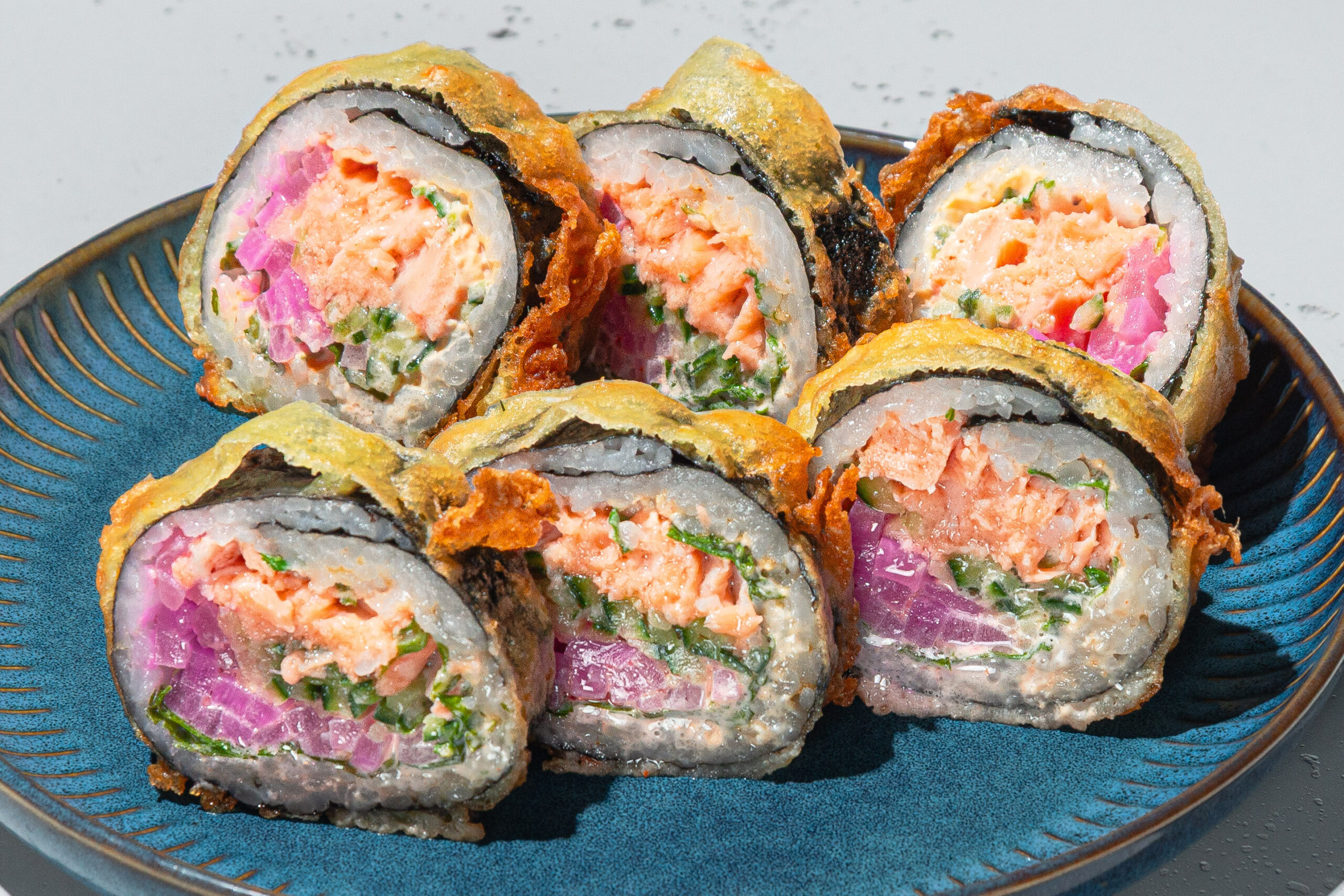 Ilość sztuk: 6 Składniki: ryż, nori, łosoś, oshinko, ogórek, sos Kobe – cała rolka w tempurze