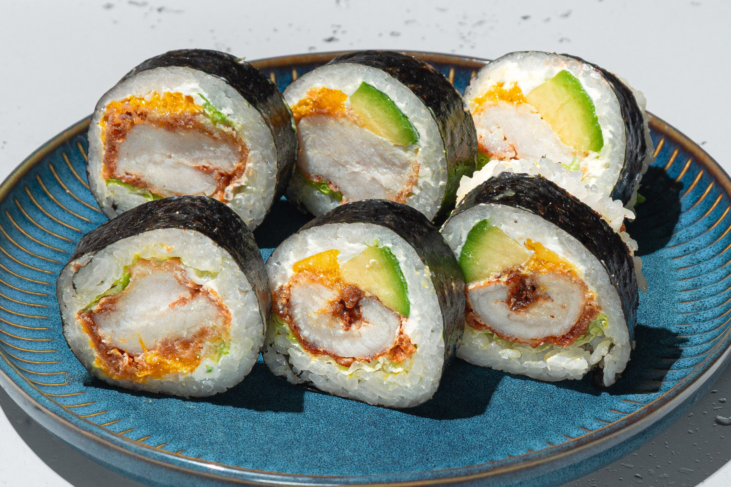 Ilość sztuk: 6 Składniki: ryż, nori, miecznik, serek, awokado, mango, sałata lodowa