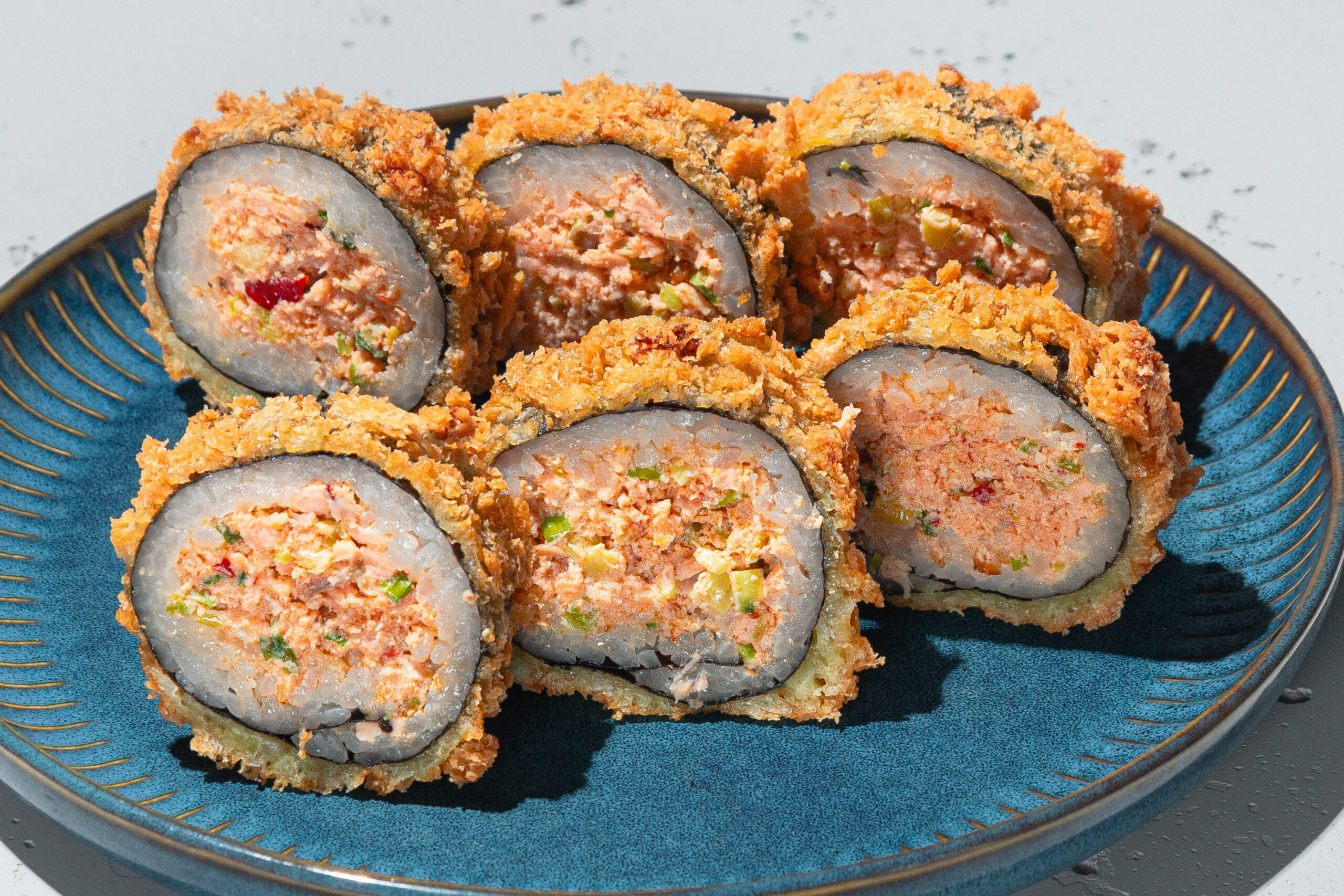 Składniki: ryż, nori, tatar z łososia, cebulka, por, sos Kobe, sos chilli, przyprawy, panierka panko
