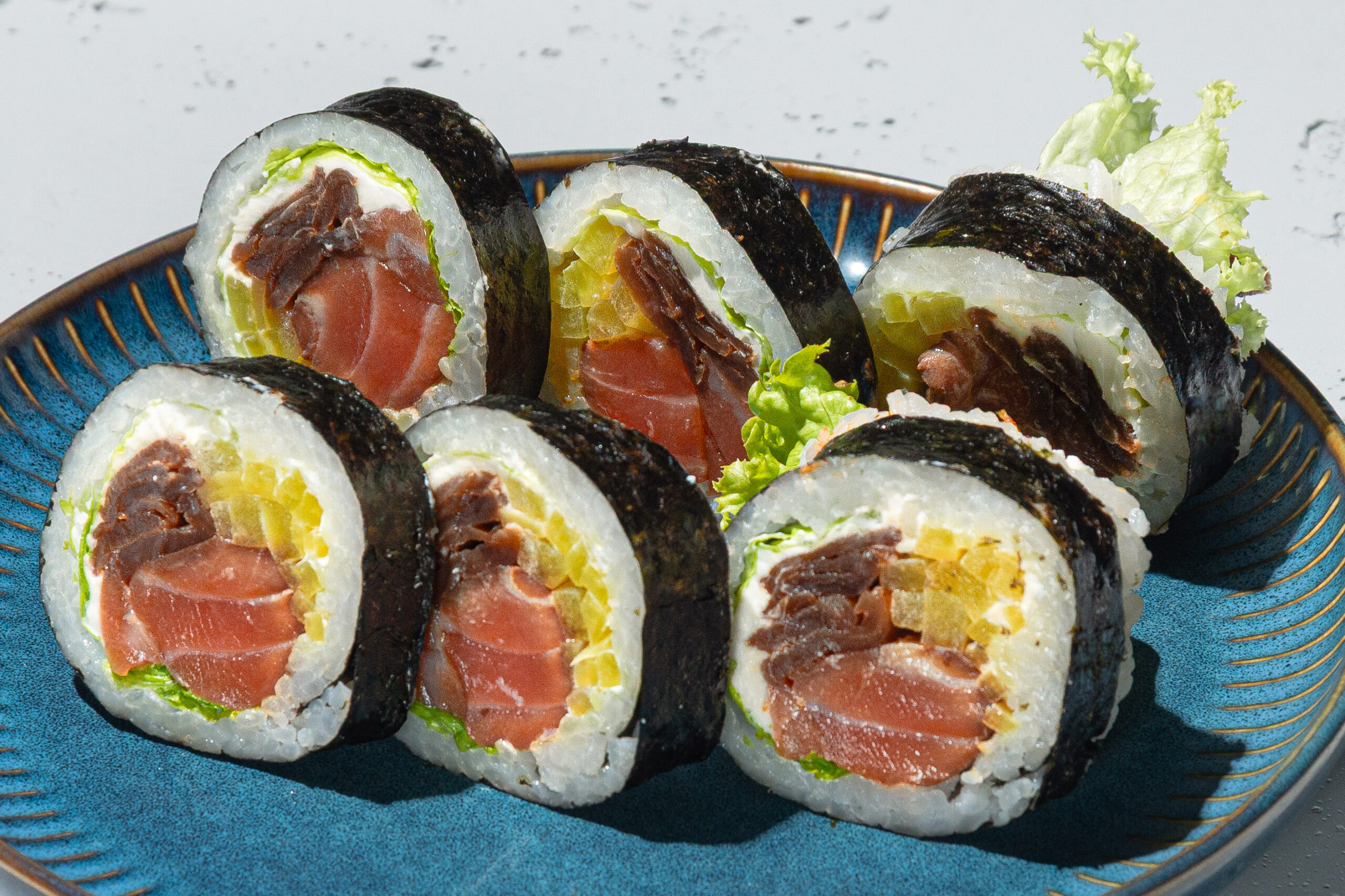 Składniki: ryż, nori, łosoś marynowany, serek, oshinko, kanpyo, sałata, sos chilli