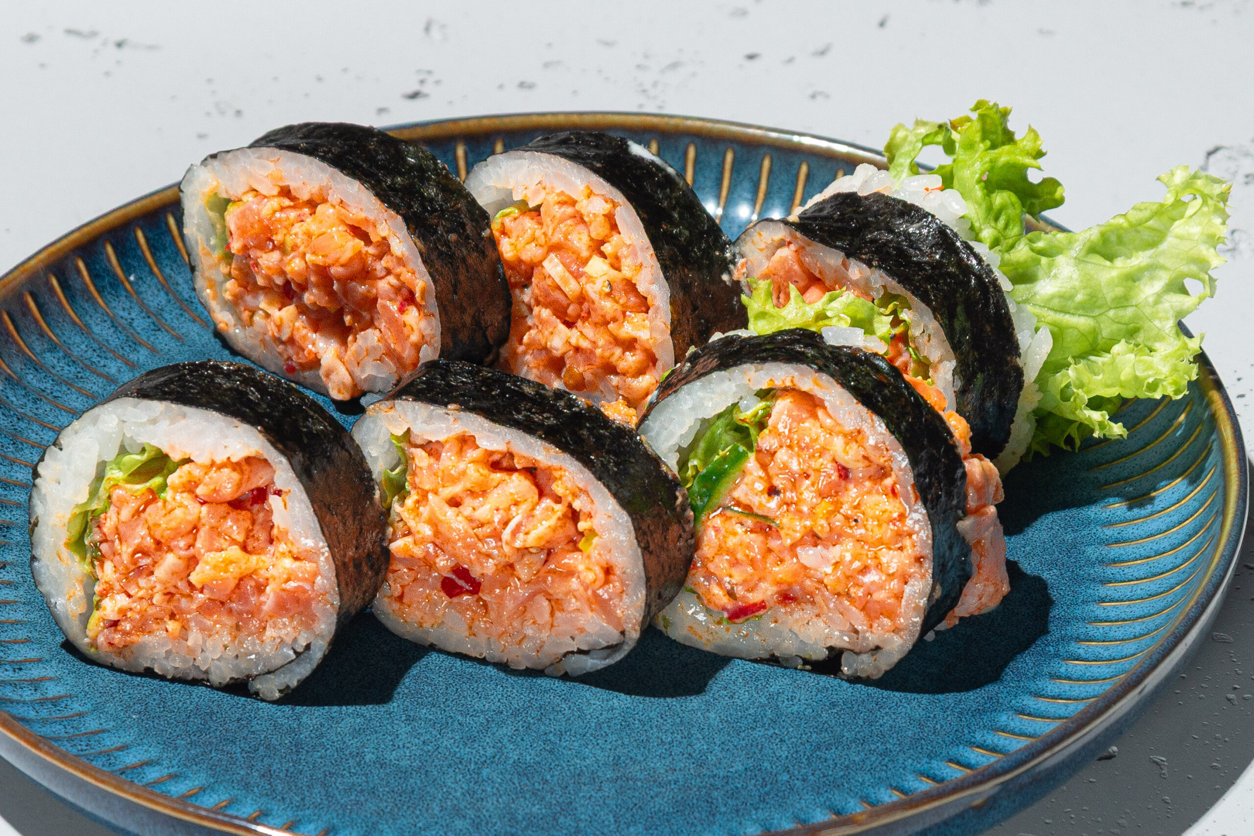 Składniki: ryż, nori, tatar z łososia, por, cebulka, chilli, sos Kobe, przyprawy
