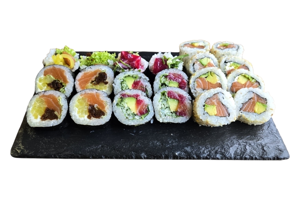 Futomaki surowe Marynowany Gravlax 6szt.- ryż, nori, łosoś marynowany w buraczkach, avocado, ogórek, rukola, sos czosnkowo-koperkowy. Futomaki surowe Marynowany Pikantny Łosoś 6 szt. – ryż, nori, łosoś marynowany pikantny, tykwa, oshinko, serek, sałata. California Klasyczny Łosoś 8szt. – ryż, nori, łosoś, serek, awokado, sezam.