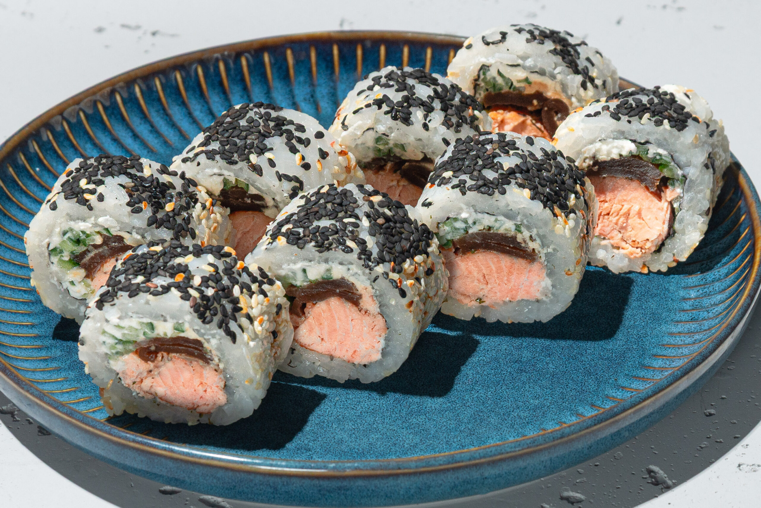 Ilość sztuk: 8 Składniki: ryż, nori, grillowany łosoś, serek, kanpyo, ogórek, sezam