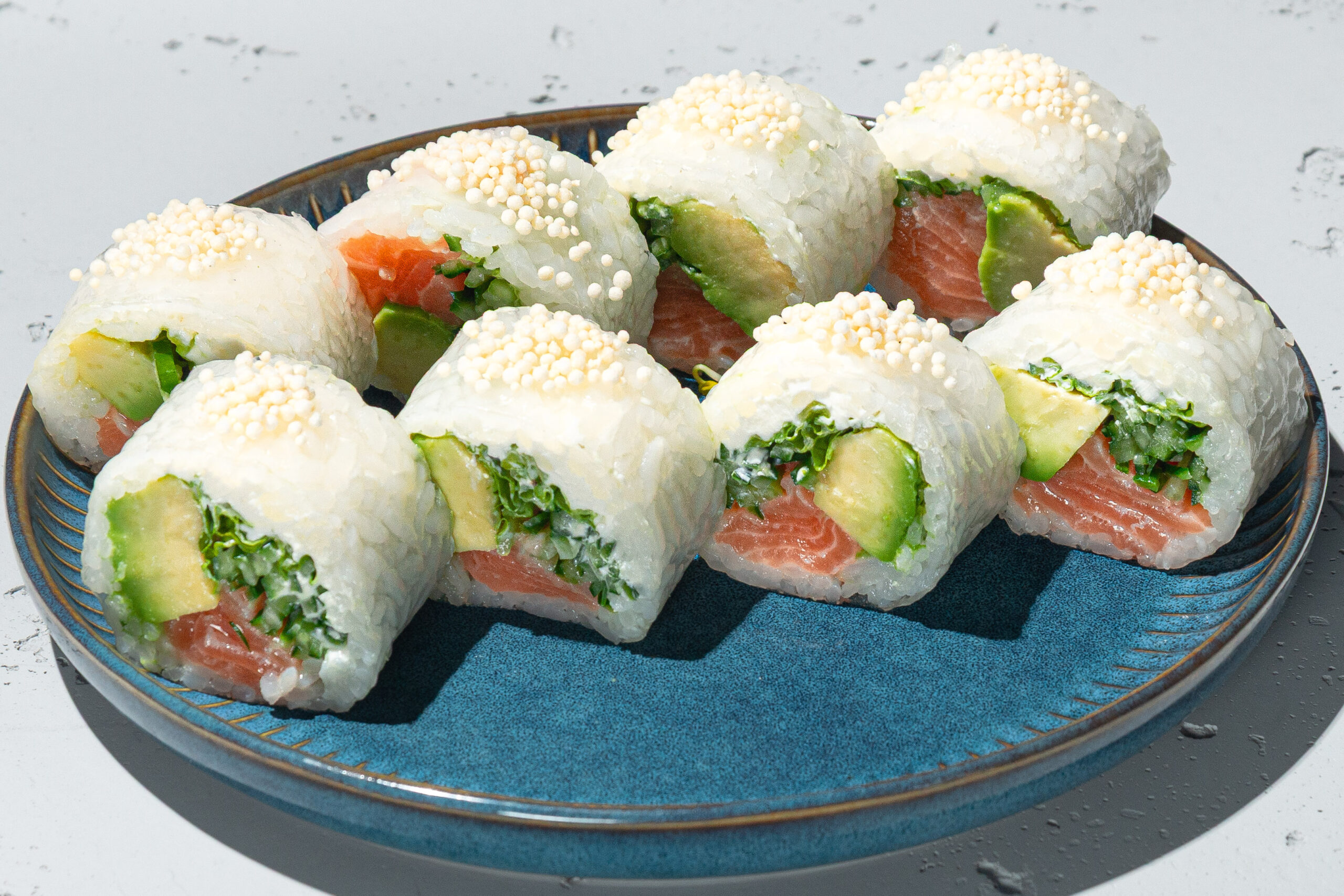 Ilość sztuk: 8 Składniki: ryż, opłatek ryżowy, łosoś, serek, awokado, ogórek, sałata, sezam