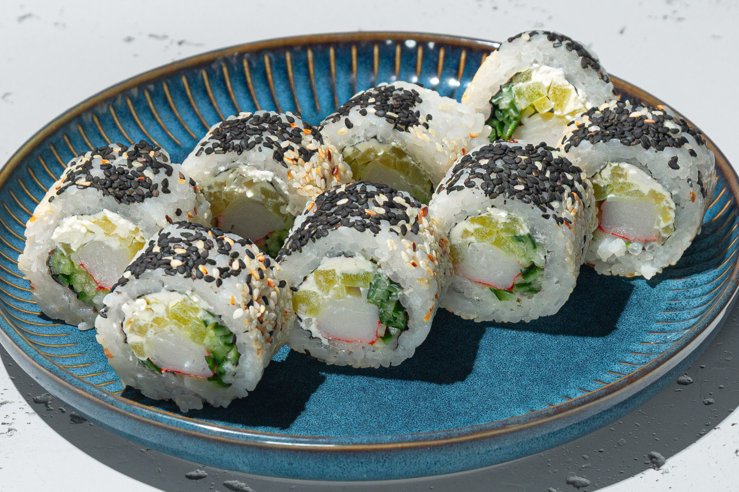 Ilość sztuk: 8 Składniki: ryż, nori, paluszek surimi, serek, oshinko, ogórek, sezam
