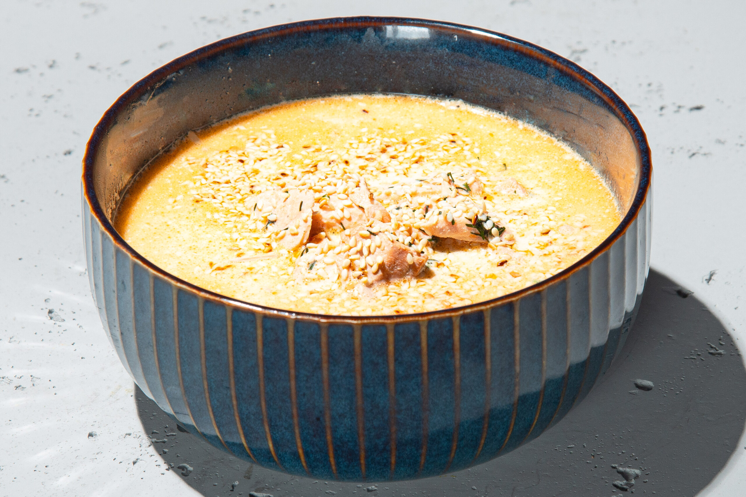Składniki: łosoś, kiełki fasoli mung, koperek, imbir, śmietanka, papryczki chilli, sezam, przyprawy