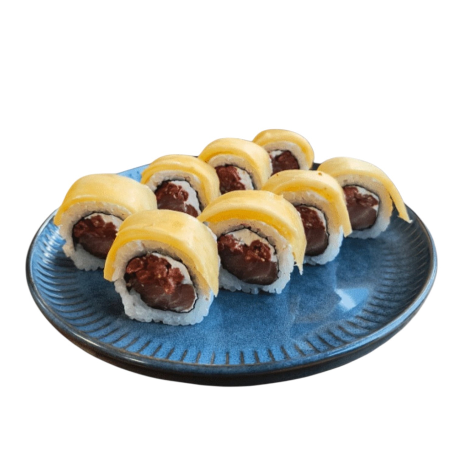 Ilość sztuk: 8 Składniki: ryż, nori, łosoś surowy, serek, jagody goji, mango na wierzchu